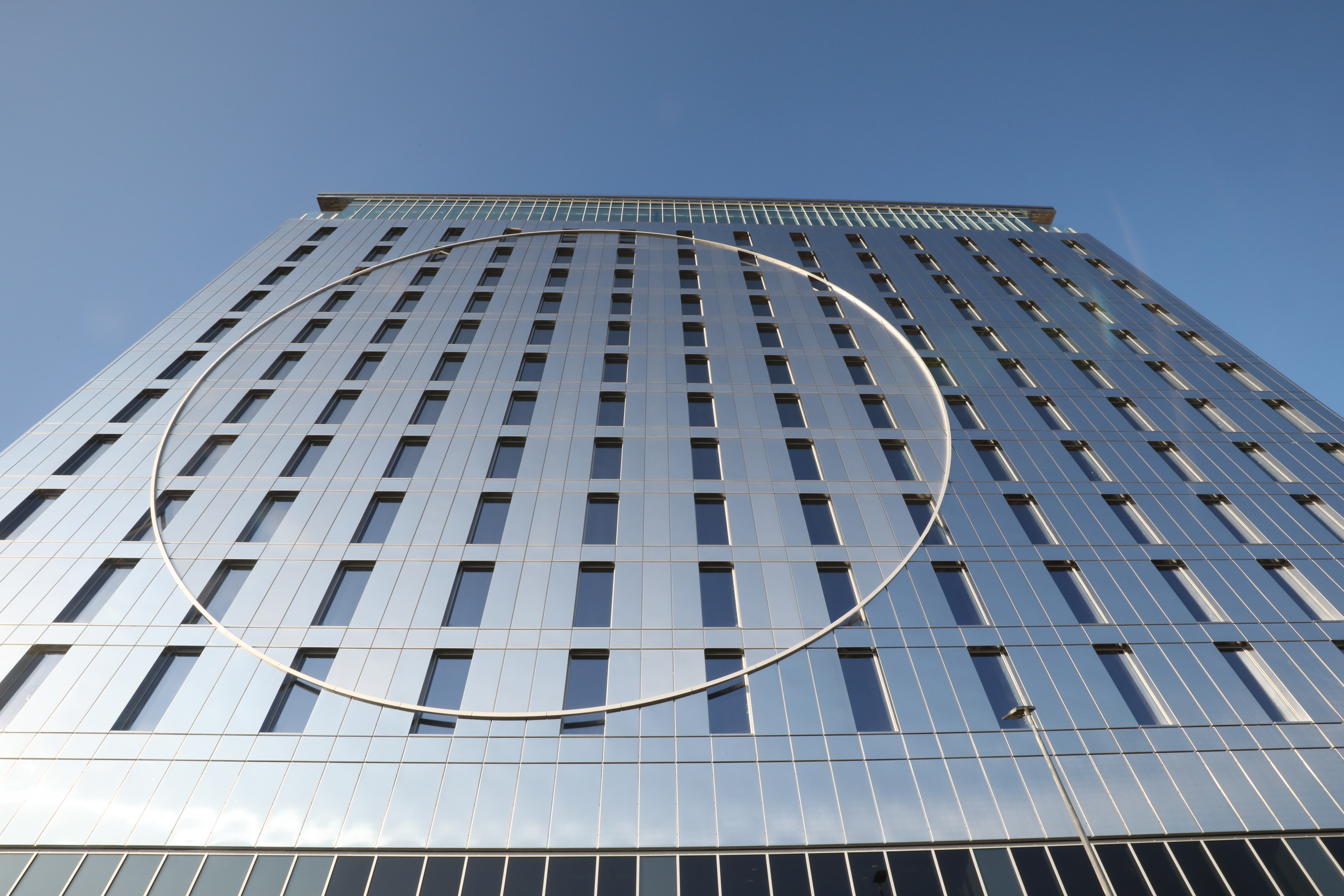 Hotel La Tour features our UltraMarine finish on 316 stainless steel. The circular design was created to align with the sun on the longest day of the year and is 30m high and lit by LED lights.